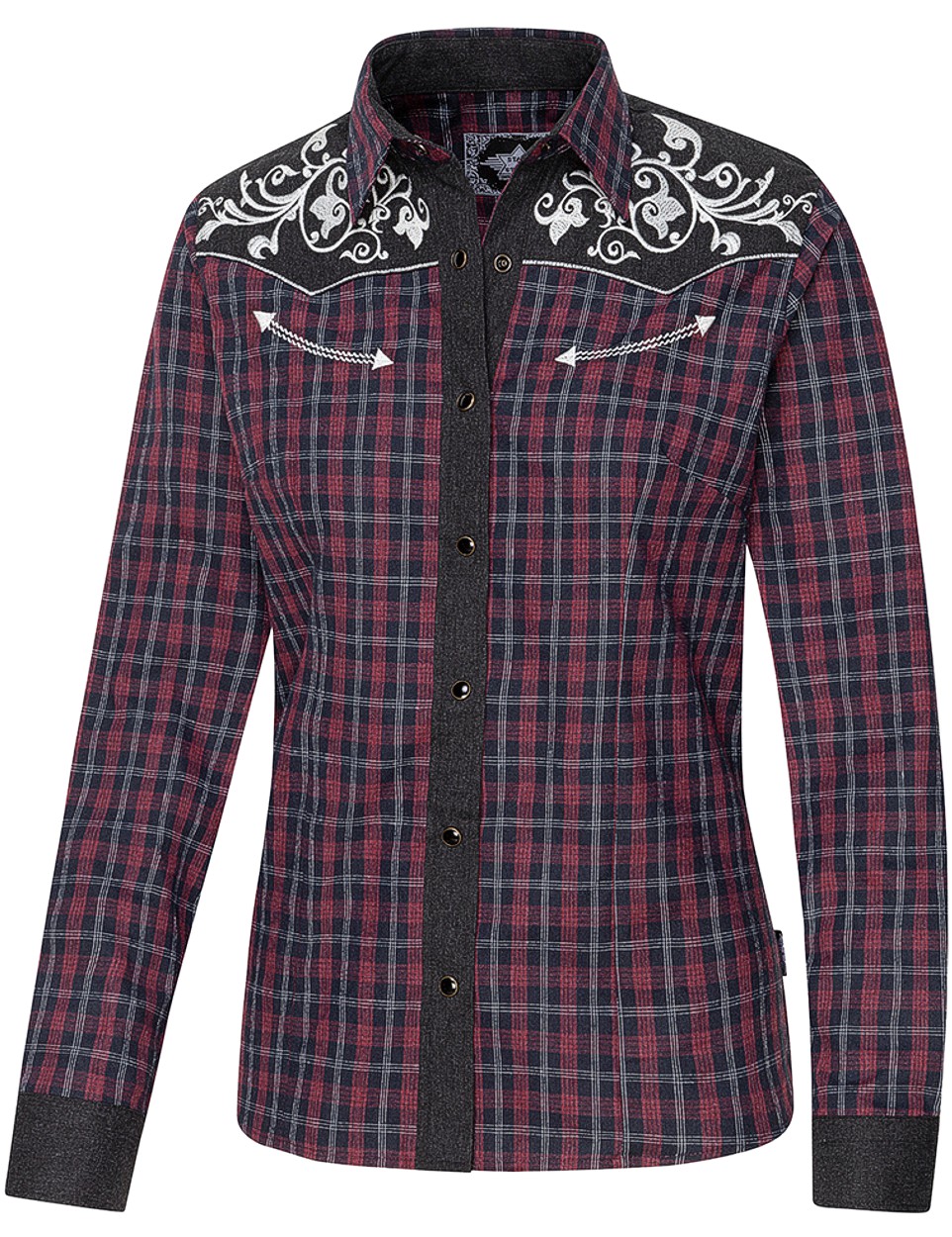 Karierte Westernbluse mit bestickter Westernpasse und Fake-Smileys. Ein eingearbeiteter Stoffbesatz im Kragen runden das Design ab. Passende Druckknöpfe an der Knopfleiste machen die Bluse zu einem echten Highlight. Passend zu Hemd Baker.