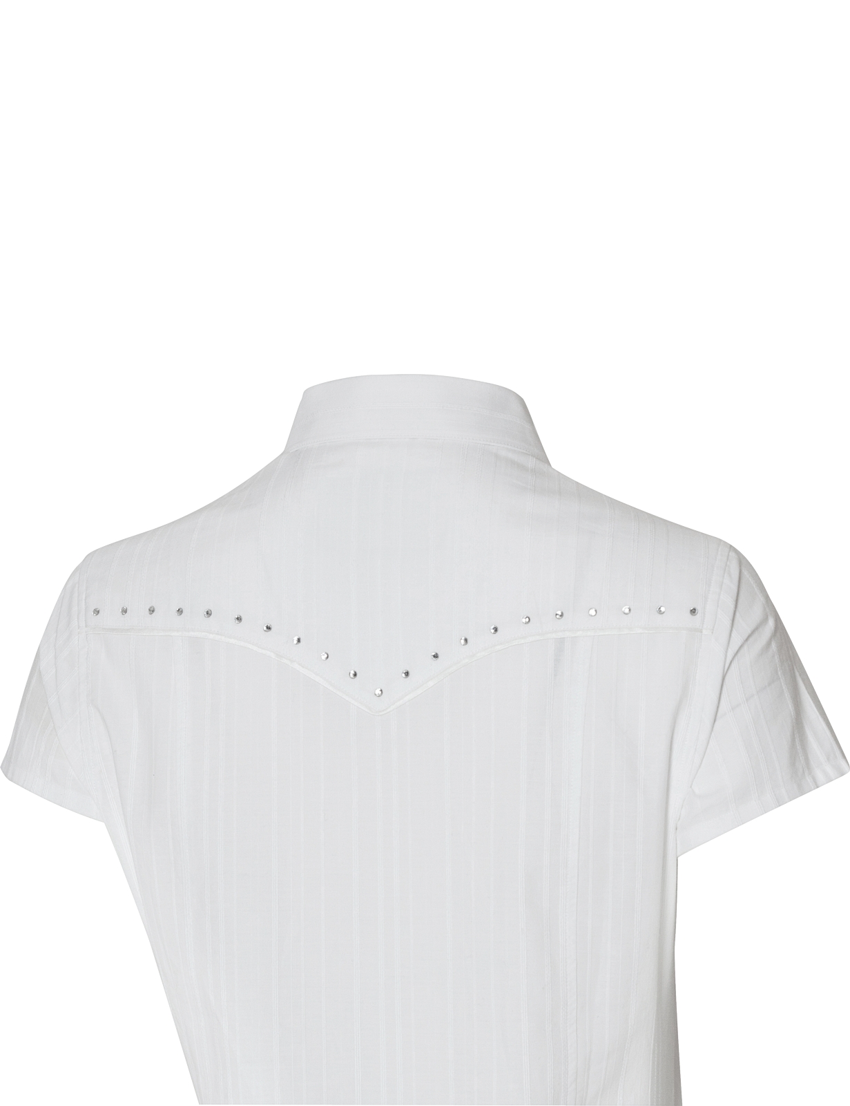 Kurzarm Westernbluse mit Satinpaspelierung und Straßsteinen an Brust und Rücken. Ein besonderer Akzent ist der Satinbesatz an Knopfleiste, Halsausschnitt und Taschenklappen. Mit Druckknöpfen.