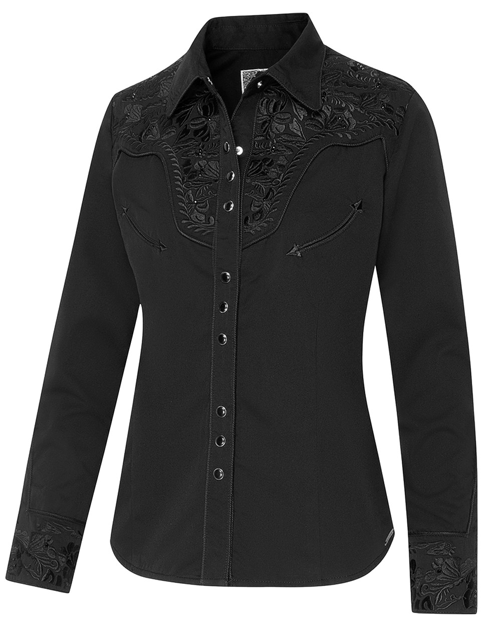 Exquisite schwarze Westernbluse.Westernpasse mit großartiger Stickerei an Brust und Rücken und entzückenden Strasssteinchen. Harmonisch abgestimmt mit Kordelpaspelierung und sechsfach geknöpften Manschetten. Passend zum Westernhemd Brody