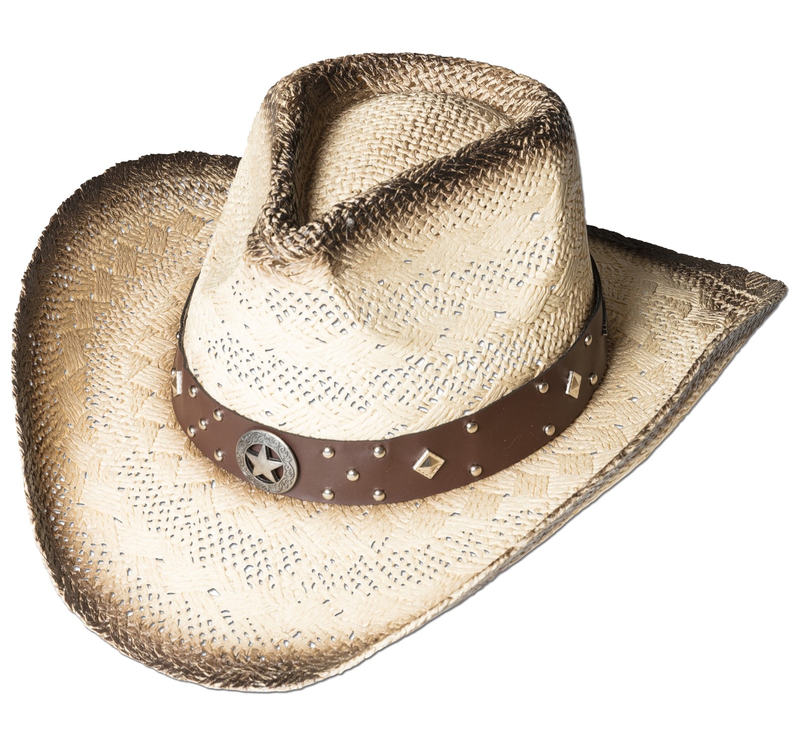 Formbarer Western Strohhut mit interessanter Einfärbung und dekorativen Hutband. Mit elastischem Innenband.