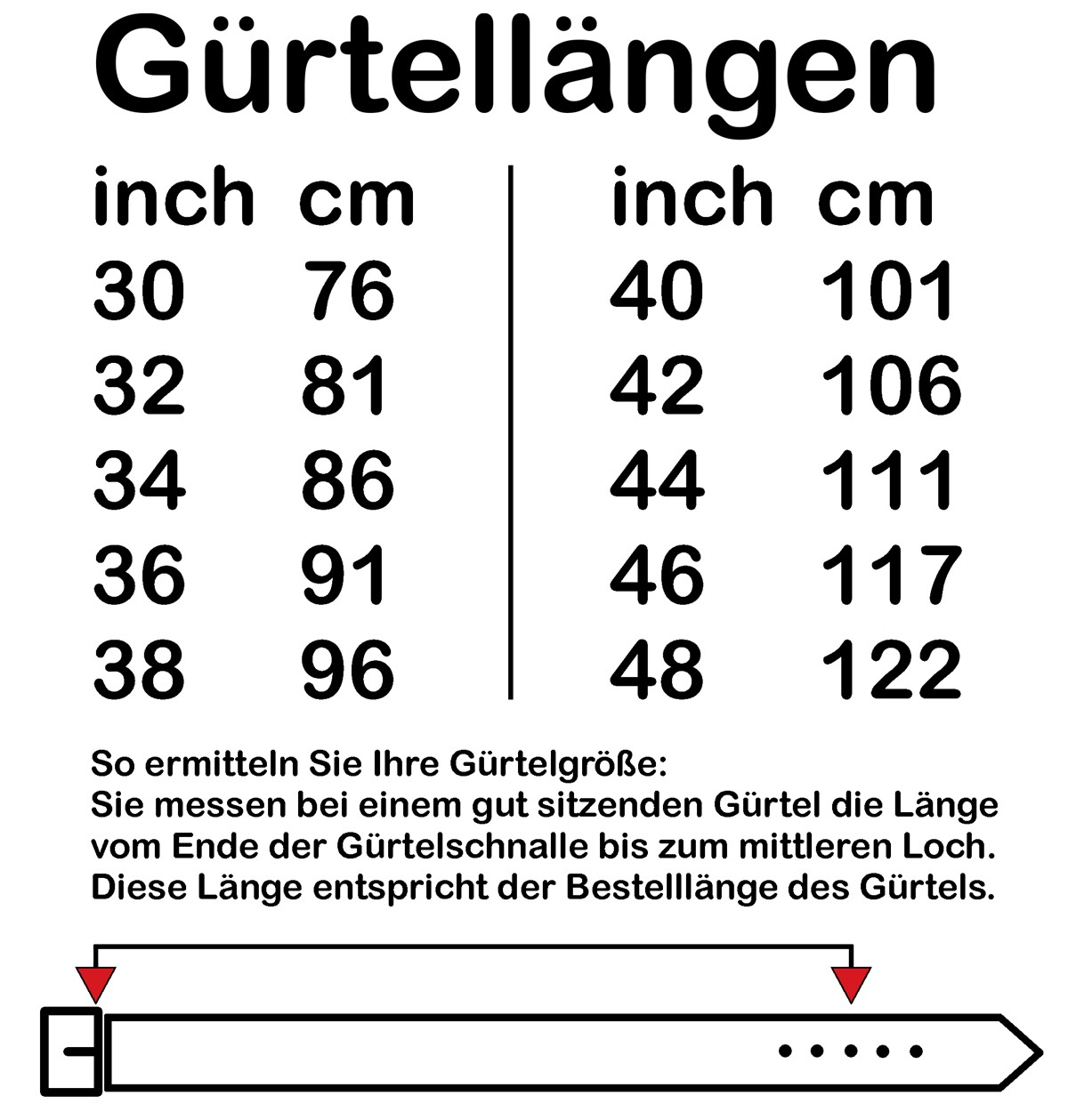 Bei unseren Gürteln wird die Gürtellänge gemessen vom Ende der Gürtelschnalle bis zum mittleren Gürtelloch